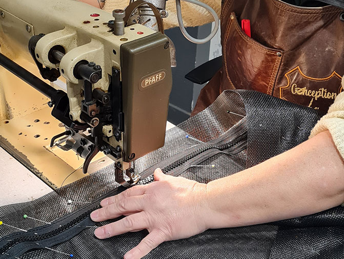 Nous réalisons de la sellerie de haute qualité. Pour cela, il est impératif d’être équipé d’un matériel performant et adapté à la couture de matières lourdes comme le cuir, le simili cuir, les toiles PVC ou les toiles d’ameublement.
